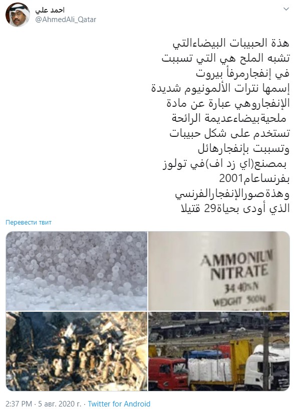 "Эти белые гранулы, которые похожи на соль - причина взрывов в Бейруте. Название вещества - нитрат аммония. У него нет запаха. Применяется в виде гранул. Нитрат аммония также был причиной мощного взрыва на заводе в Тулузе во Франции в 2001 году.. Это фотографии взрыва на заводе, в результате которого погибли 29 человек", - написал он.
