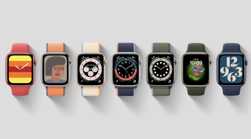 Часы Watch Series 6 оснащены датчиком измерения уровня кислорода в крови. Линейка включает четыре цвета: синий, золотой, графитовый и красный. Часы получили чип Apple 6-го поколения на базе A13 Bionic (на 20% быстрее, чем Series 5). Кроме того новые часы представлены коллекцией новых циферблатов, у них новые растягивающиеся ремни.