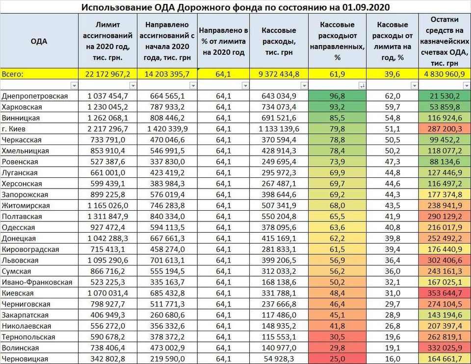 По состоянию на 31 августа из 14,203 млрд. гривен в регионах уже потрачено 9,372 млрд.