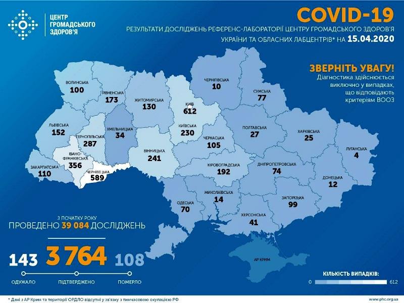 При этом за сутки 14 апреля в Украине подтверждено 392 новых случая COVID-19. Всего же из 3764 лабораторно подтвержденных случаев COVID-19, 108 случаев были летальными, 143 человека выздоровели.