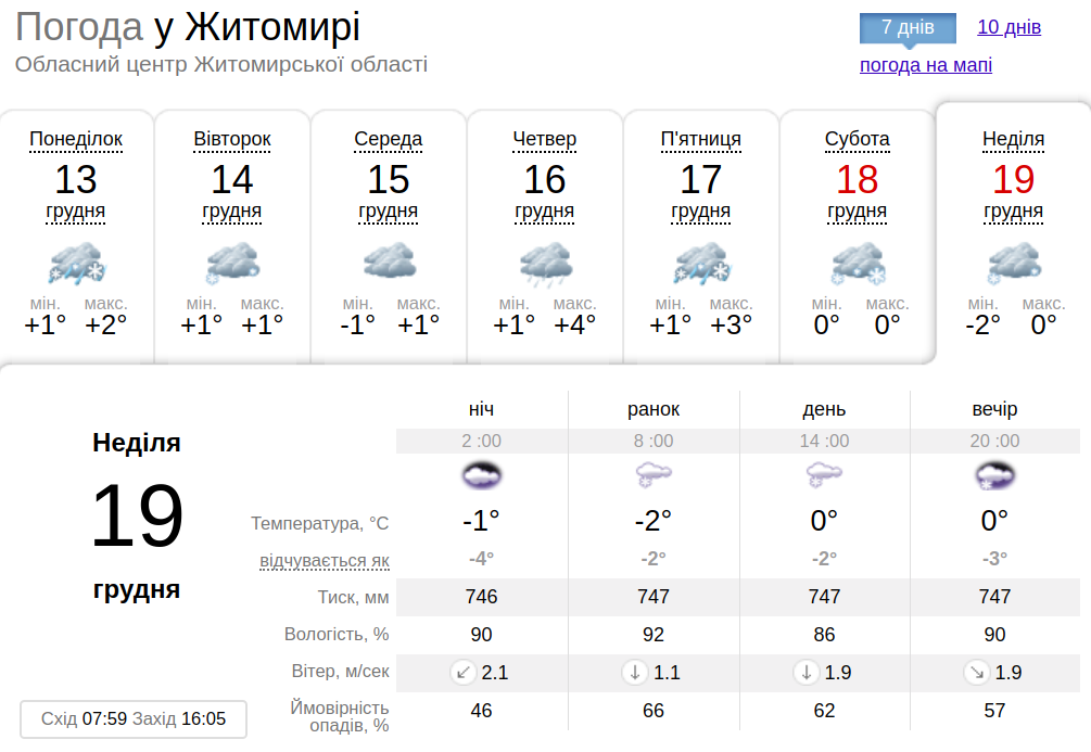 Весь день в Житомире будет облачным. С утра и до позднего вечера будет идти мелкий снег. Температура ночью – 1 градус, а днем – 0 градусов.