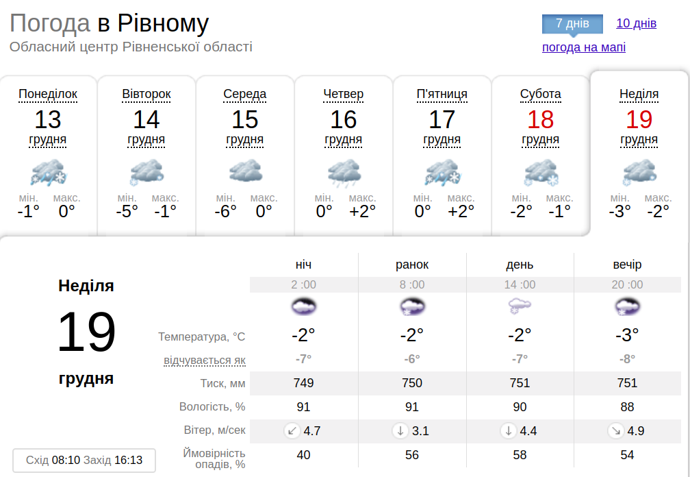 В Ровно солнце в этот день будет редко показываться из-за облаков. С утра и до позднего вечера будет идти мелкий снег. Ночью и днем температура воздуха ожидается -2 градуса, а вечером станет -3 градуса.