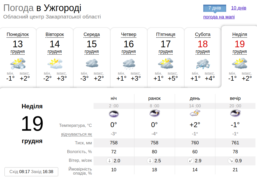 В Ужгороде на протяжении всего дня небо будет покрыто облаками. Без осадков. Ночью температура будет 0 градусов, а днем прогреется до +2 градусов.