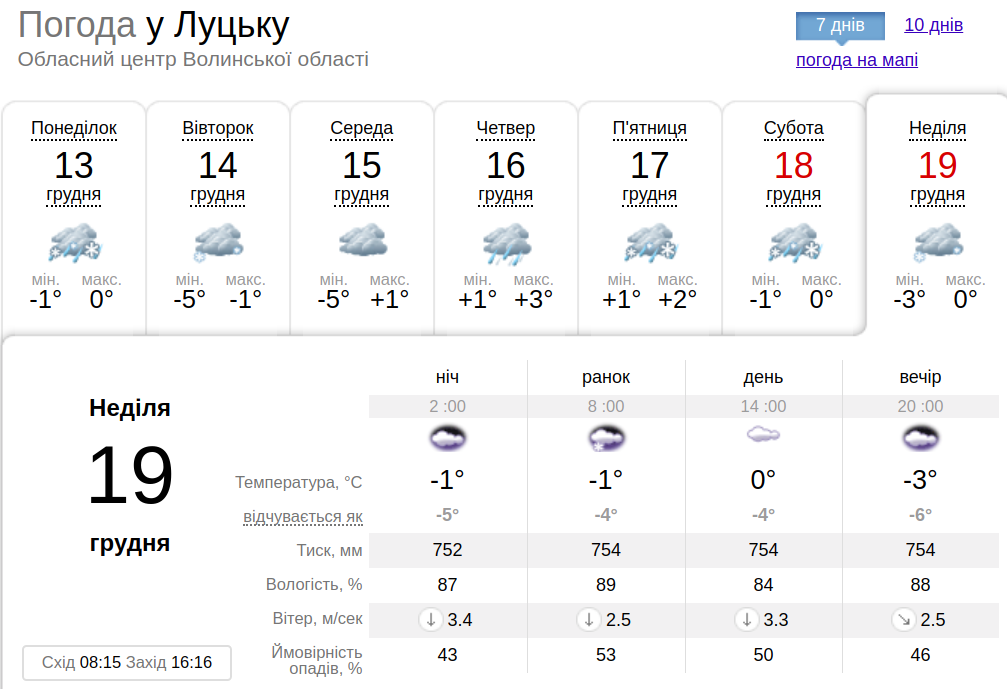 Весь день в Луцке будет облачным. Утром ожидается мелкий снег, который к полудню должен закончиться. Вся оставшаяся часть дня пройдет без осадков. Температура ночью и днем – 1 градус.