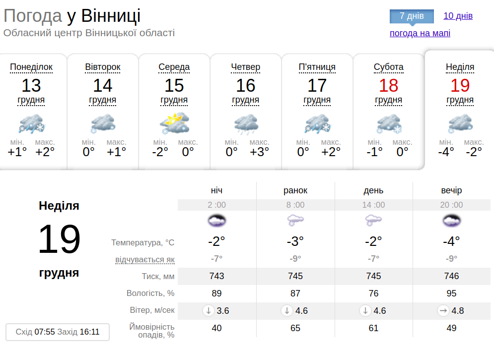 В Виннице на протяжении всего дня будет стоять облачная погода. Утром и днем ожидается мелкий снег, который закончится ближе к вечеру. Столбик термометра днем будет -2 градуса, а вечером опуститься до -4 градусов.