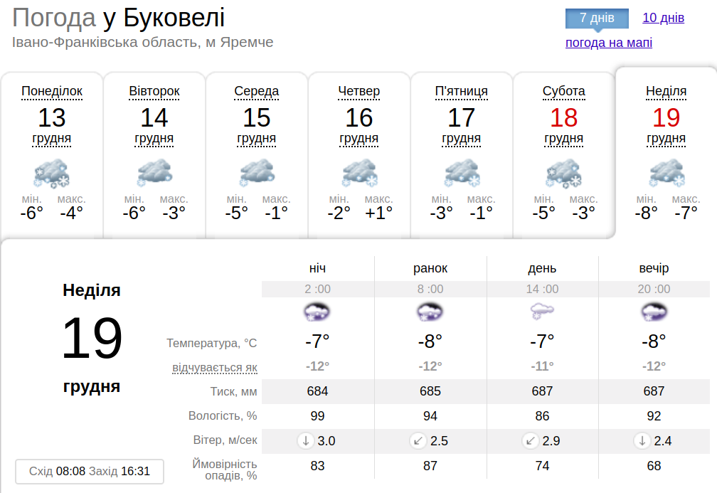 На протяжении всего дня погода в Буковеле будет пасмурной. С самого утра будет идти снег. Днем он может ослабнуть, но не успокоится до самого вечера. Температура днем и ночью – 7 градусов.
