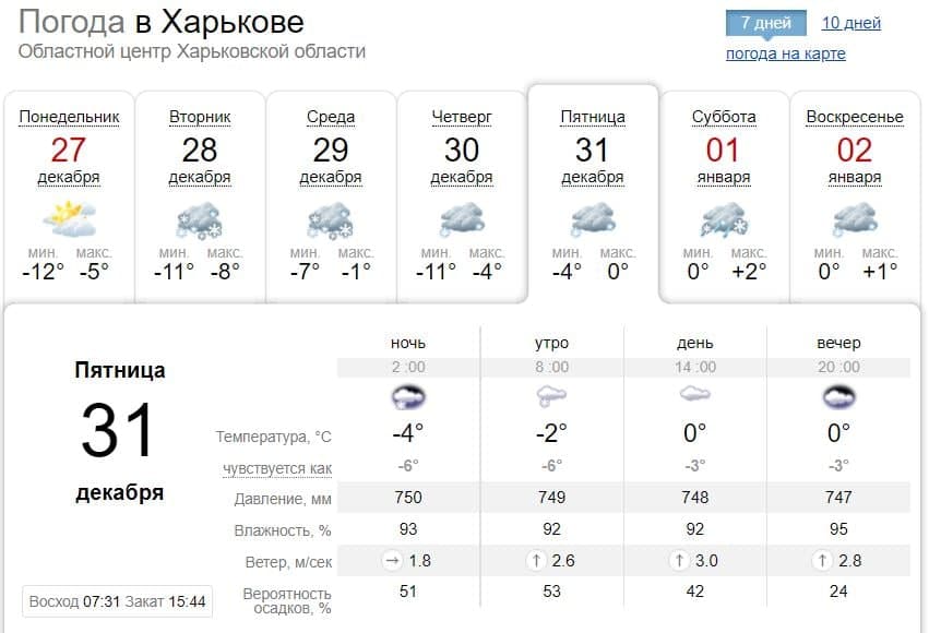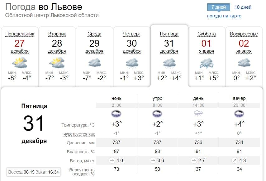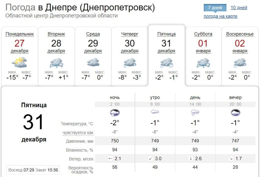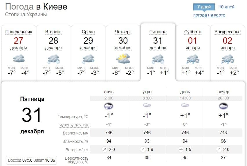 В пятницу, 31 декабря, в Украине ожидается облачная погода. Только в Днепре будет минусовая температура, а в остальных крупных городах плюс.