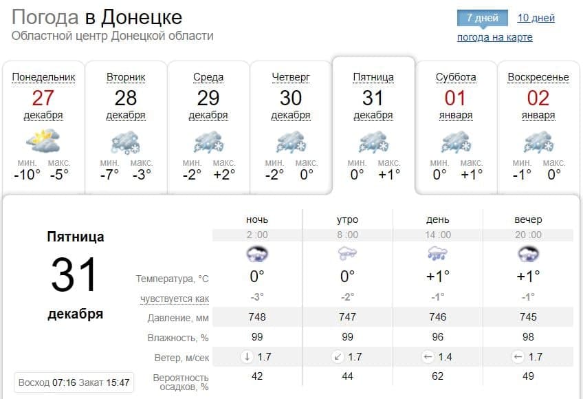 В Донецке солнце в этот день будет редко показываться из-за облаков. Утренний снег постепенно перейдет в сильный дождь, который вечером сменится мокрым снегом. Температура будет +3 градуса, а вечером +2.