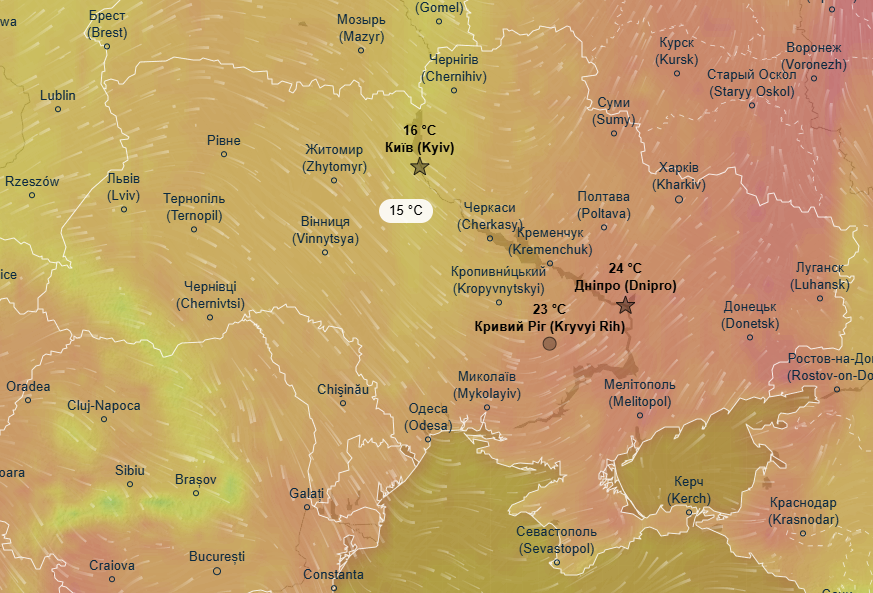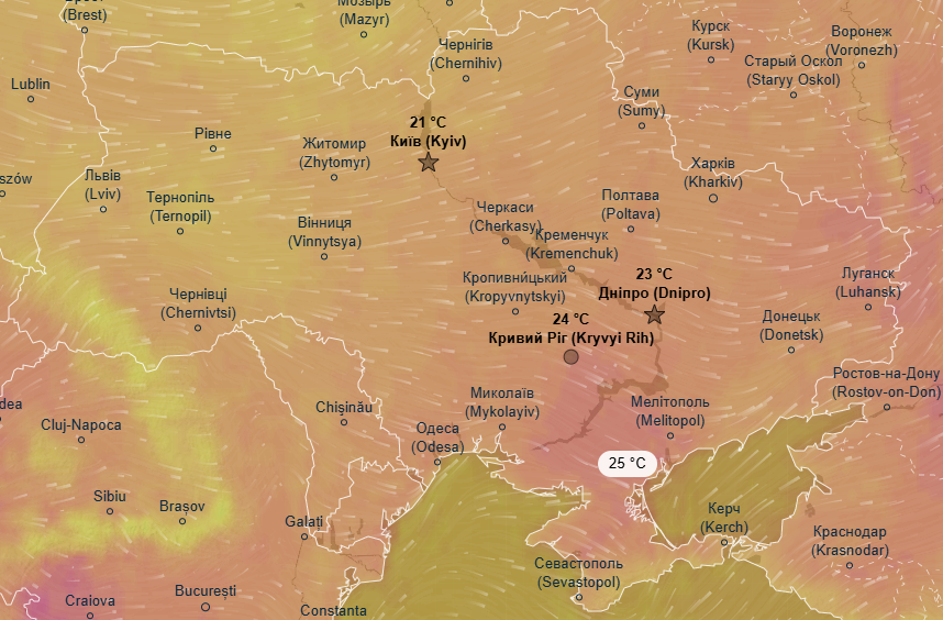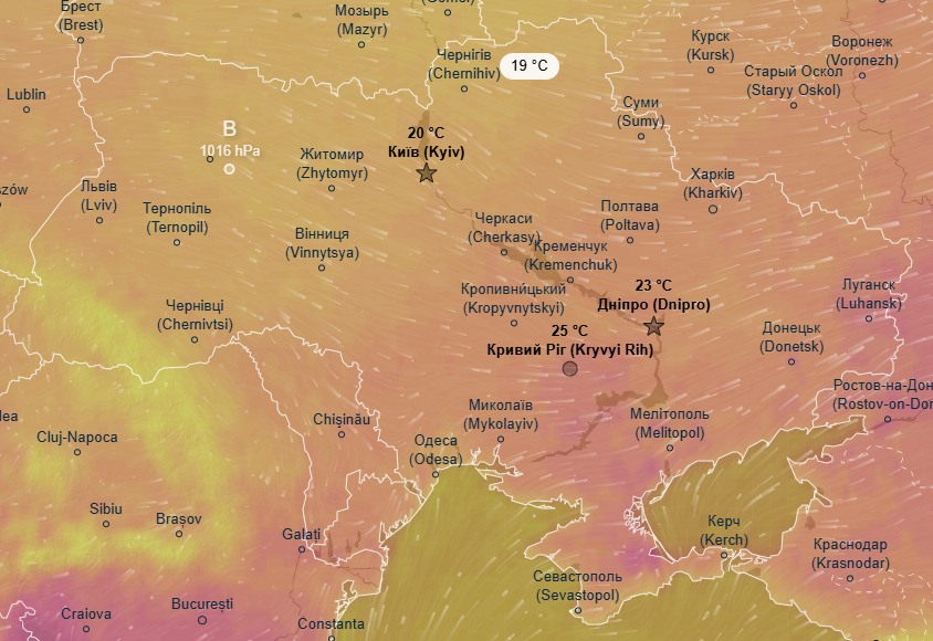 Температура воздуха разделит страну на две части – жаркую и прохладную. В восточных, южных и некоторых северных областях воздух прогреется от +23 до +27 градусов. А вот на западе будет прохладно – только +12…+15 градусов. В Карпатах столбики термометров опустятся до +9 градусов.