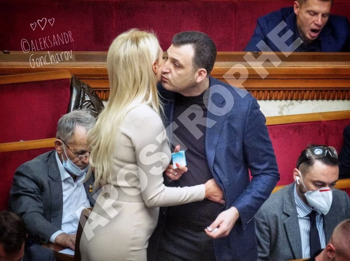 Во время заседания Верховной Рады 5 ноября депутаты от "Слуги народа" Ирина Аллахвердиева и Игорь Васильковский попали в объектив фотокорреспондента "Апострофа" в момент теплых объятий.