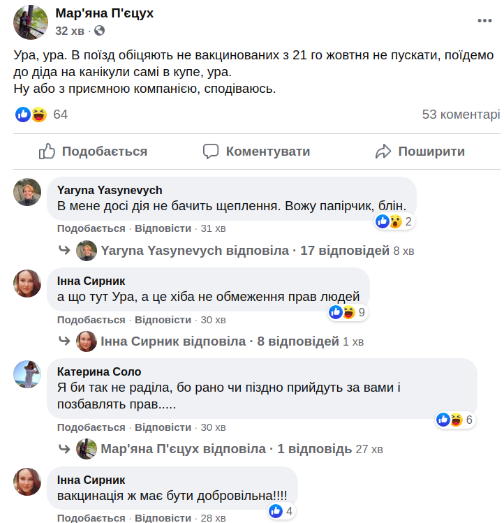 "Ура, ура! В поезд обещают не вакцинированных граждан с 21 октября не пускать, поедем на каникулы к деду сами в купе, ура", - написала одна из пользовательниц.
