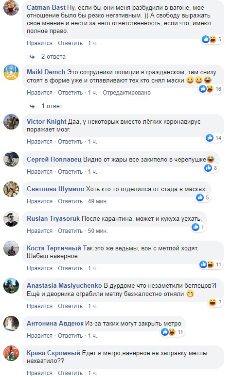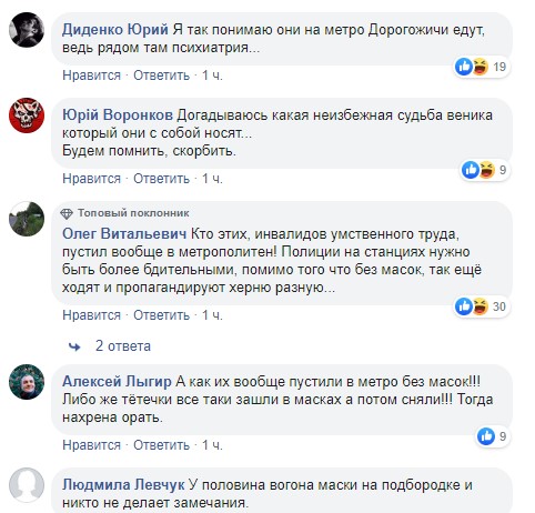 "Ну, психушки ж сокращают...вот и результат", "Все об этом разводняке давно знают и правильно сделали,но они не учли,что зомбированным все равно будет пофиг", "После чего первые буду лежать и кричать спасите - помогите.Такие должны сразу подписывать отказ от лечения и точка, не занимать места тех кого стоит спасать", "Я так понимаю они на метро Дорогожичи едут, ведь рядом там психиатрия", "А как их вообще пустили в метро без масок! Либо же тетечки все таки зашли в масках а потом сняли! Тогда зачем орать", "Кто этих, инвалидов умственного труда, пустил вообще в метрополитен! Полиции на станциях нужно быть более бдительными, помимо того что без масок, так еще ходят и пропагандируют", - пишут они.