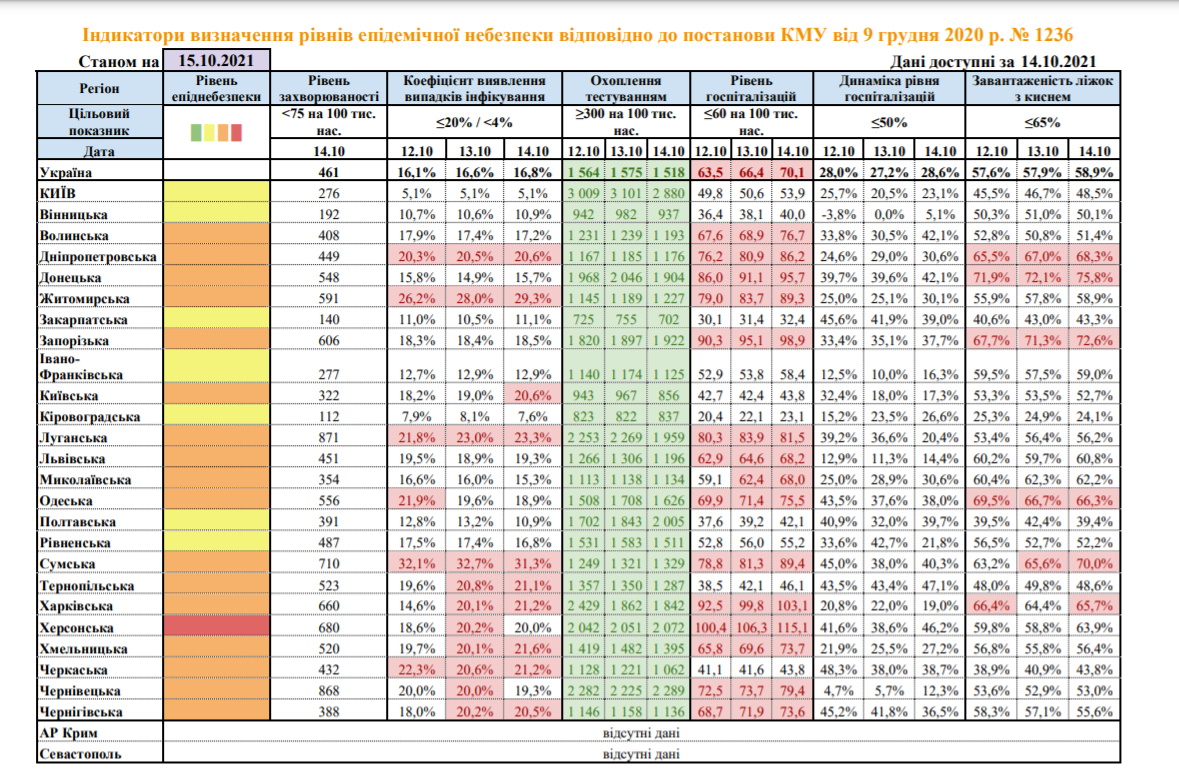 Отмечается, что высокий уровень заболеваемости зафиксирован в Луганской (871 на 100 тыс. населения), Черновицкой (868 на 100 тыс. населения) и Херсонской (680 на 100 тыс. населения) областях. Показатель загруженности коек с кислородом (определен на уровне 65%), превышен в Днепропетровской, Донецкой , Запорожской, Одесской, Сумской, Харьковской областях.