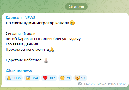 Отмечается, что Карлсон - командир отряда БПЛА, воевавший в кадыровском "Ахмате". Он был ликвидирован под Клещеевкой.