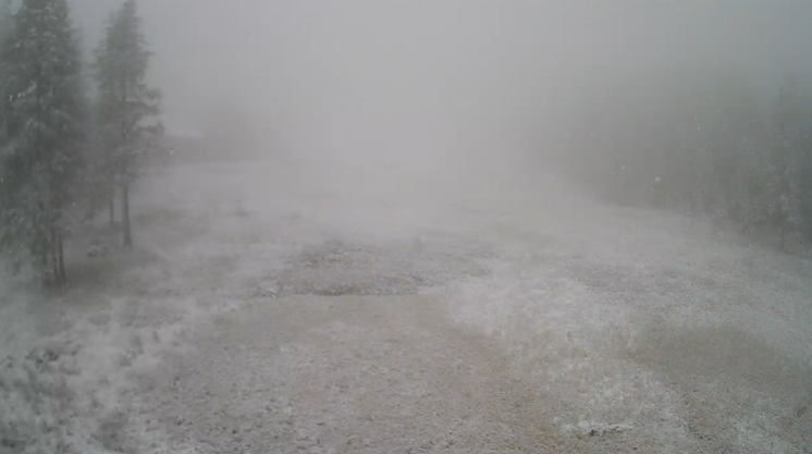 Выпал снег и на горнолыжном курорте Буковель - веб-камера с верхней станции подъемника 5 показывает заснеженную трассу, температура воздуха - 2.5°C.