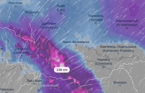 По данным сайта Ventusky, по состоянию на 12:00 6 февраля слой снега в Карпатах местами достигает 138 сантиметров.
