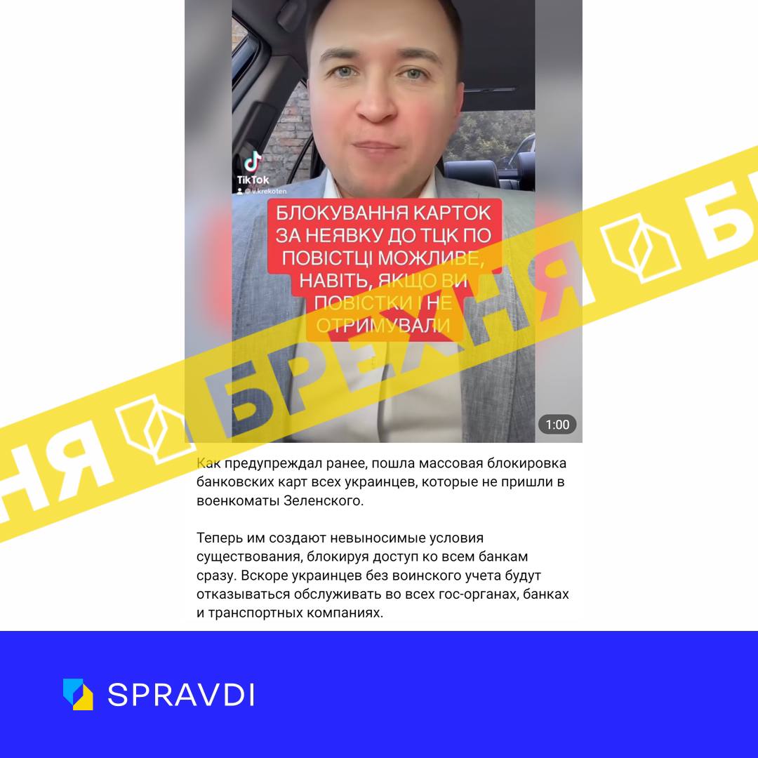 Так, российский пропагандист Дмитрий Василец распространил информацию, что якобы в Украине блокируют банковские карты военнообязанных, не пришедших в Территориальный центр комплектования и социальной поддержки, а также госорганы, банки и транспортные компании не будут обслуживать граждан без военного учета.