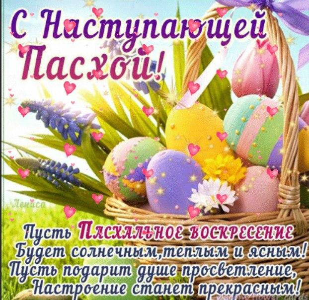 Светлый и радостный праздник на пороге, поздравляю с наступающей Пасхой! Пусть в этот день сердце избавится от обид и печали, пусть все тревоги уйдут с души. Желаю семейного блага, любви, понимания, здравия, верности, почитания в обществе, Божьей помощи в добрых делах и поступках, удачи и достатка.