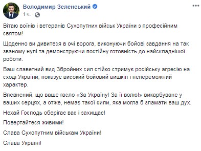 "Поздравляю воинов и ветеранов Сухопутных войск Украины с профессиональным праздником! Ежедневно вы смотрите в глаза врага, выполняя боевые задания на так называемом "нуле" и демонстрируя постоянную готовность к сложной работе. Ваш славный вид Вооруженных сил устойчиво сдерживает российскую агрессию на востоке Украины, показывает высокий боевую выучку и непобедимый характер. Уверен, что ваш лозунг "За Украину! За ее свободу!" высечен в ваших сердцах, а значит, нет такой силы, которая могла бы сломать ваш дух", - написал глава государства.