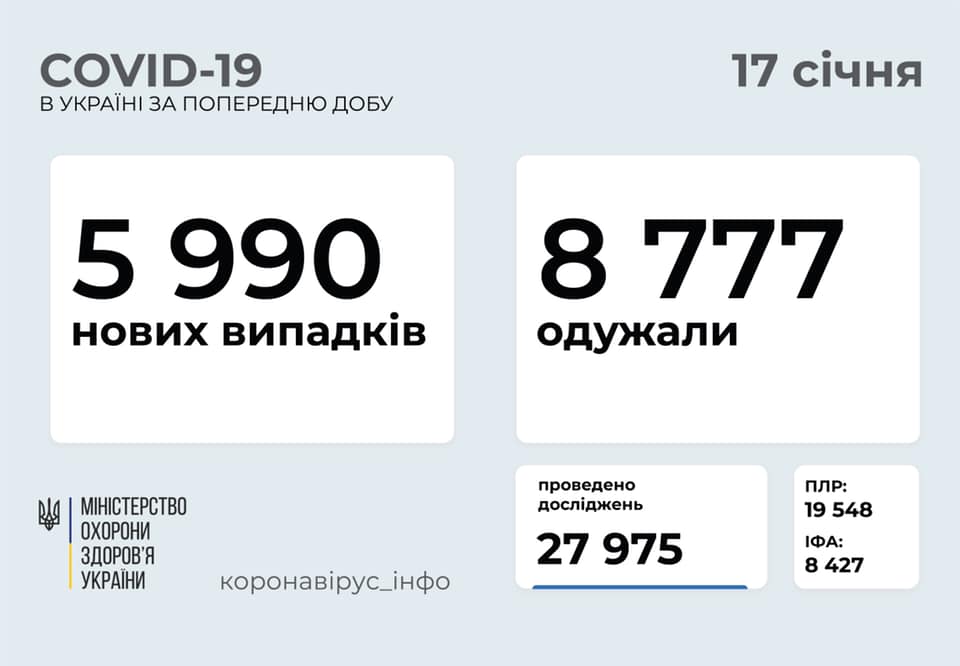 В Украине за минувшие сутки, 16 января, зафиксировано 5 990 новых случаев коронавируса.