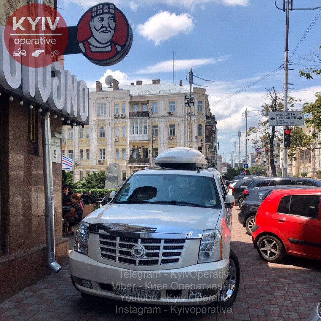 На улице Шота Руставели в Киеве неизвестный водитель автомобиля Cadillac припарковал свое транспортное средство рядом с рестораном грузинской кухни, не оставив на тротуаре прохода для пешеходов.