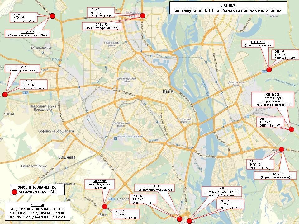 Контрольно-пропускные пункты размещаться на въездах и выездах из Киева по следующим адресам: