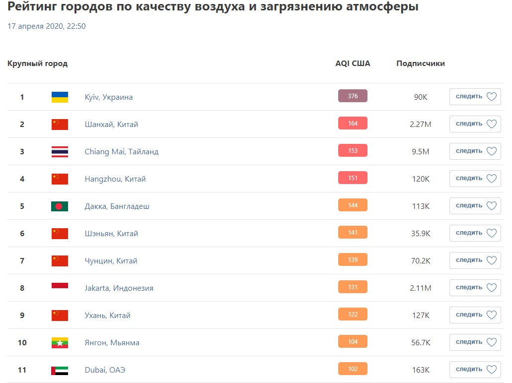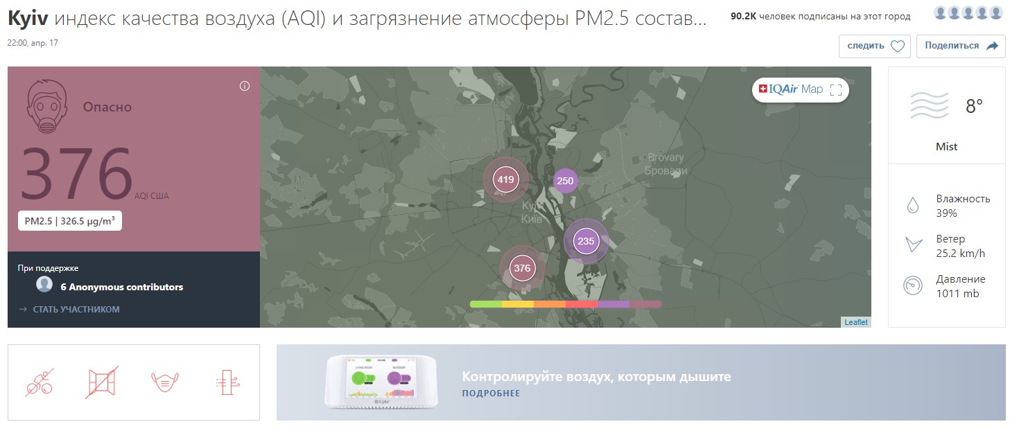 Об этом свидетельствуют данные портала iqair, который отслеживает уровень загрязнения воздуха в режиме реального времени.