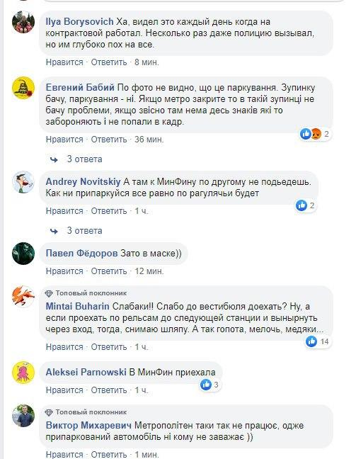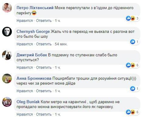"А там к МинФину по другому не подъедешь. Как ни припаркуйся все равно по рагулячьи будет", "Слабаки!! Слабо до вестибюля доехать? Ну, а если проехать по рельсам до следующей станции и вынырнуть через вход, тогда, снимаю шляпу...", "Метро все равно не работает", "Зато в маске", " Жаль что в переход не въехала с разгона вот это было бы шоу", - пишут комментаторы.