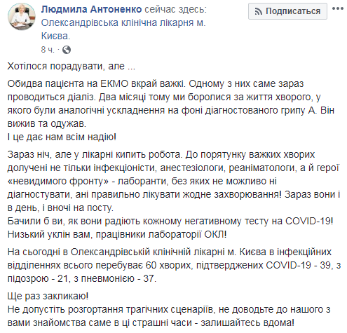 "Одному из них именно сейчас проводится диализ. Два месяца назад мы боролись за жизнь больного, у которого были аналогичные осложнения на фоне диагностированного гриппа А. Он выжил и выздоровел. И это дает нам всем надежду!", - написала Антоненко.