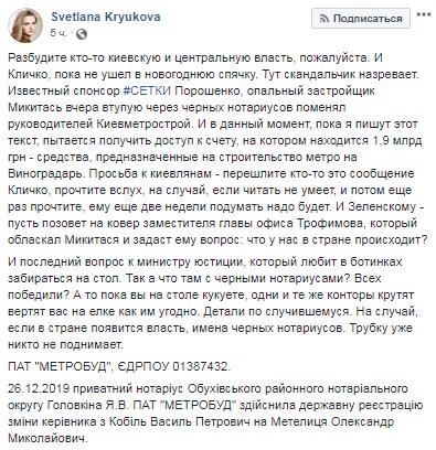 "Скандальчик назревает. Известный спонсор сетки Порошенко, опальный застройщик Микитась через черных нотариусов поменял руководителей "Киевметрострой". В данный момент пытается получить доступ к счету, на котором находится 1,9 млрд грн – средства, предназначенные на строительство метро на Виноградарь", – возмутилась Крюкова.