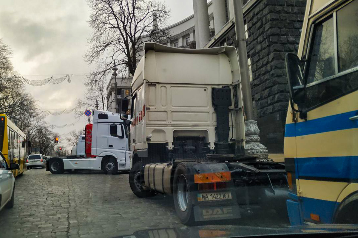 Многотонные автомобили стоят на улице Михаила Грушевского, возле правительственных зданий. Из-за этого в Киеве образовались пробки.