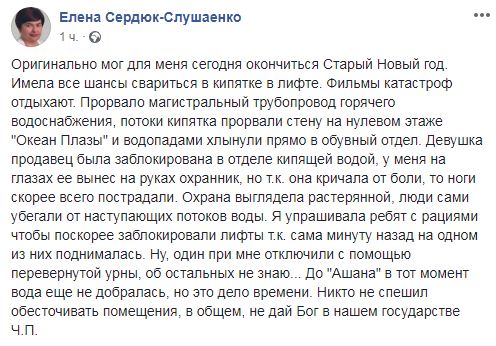 "Имела все шансы свариться в кипятке в лифте. Фильмы катастроф отдыхают. Прорвало магистральный трубопровод горячего водоснабжения, потоки кипятка прорвали стену на нулевом этаже "Океан Плазы" и водопадами хлынули прямо в обувный отдел. Девушка продавец была заблокирована в отделе кипящей водой, у меня на глазах ее вынес на руках охранник, но т.к. она кричала от боли, то ноги скорее всего пострадали. Охрана выглядела растерянной, люди сами убегали от наступающих потоков воды", - написала пользователь сети Елена Сердюк-Слушаенко.