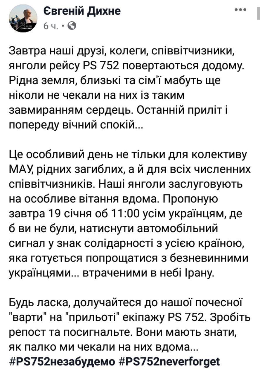 "Наши ангелы заслуживают особое приветствие дома. Предлагаю завтра 19 января в 11:00 всем украинцам, где бы вы ни были, нажать автомобильный сигнал в знак солидарности со всей страной, которая готовится попрощаться с невинными украинцами, потерянными в небе Ирана. Сделайте репост и посигнальте. Они должны знать, как горячо мы ждали их дома ", - обратился к украинцам Дыхне.