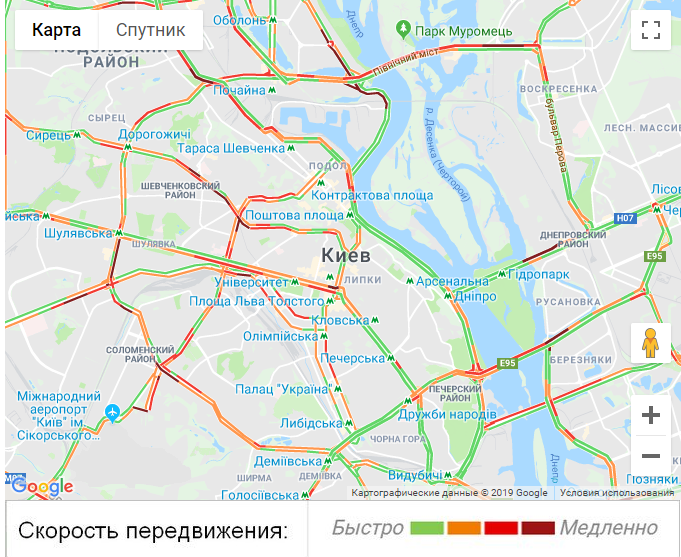 Больше всего движение возле метро "Льва Толстого", "Дружбы народов", "Университет", "Шулявка", а также в Святошинском районе, в районе Гидропарка и на Троещине. Там дороги обозначены бордовым – что свидетельствует об очень медленном движении.