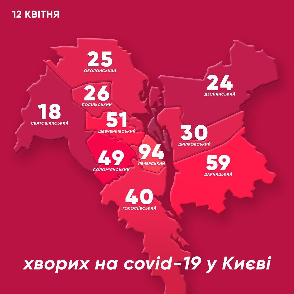 По данным на воскресенье, 12 апреля, самое большее количество зараженных коронавирусом - в Печерском и Дарницком районах Киева.