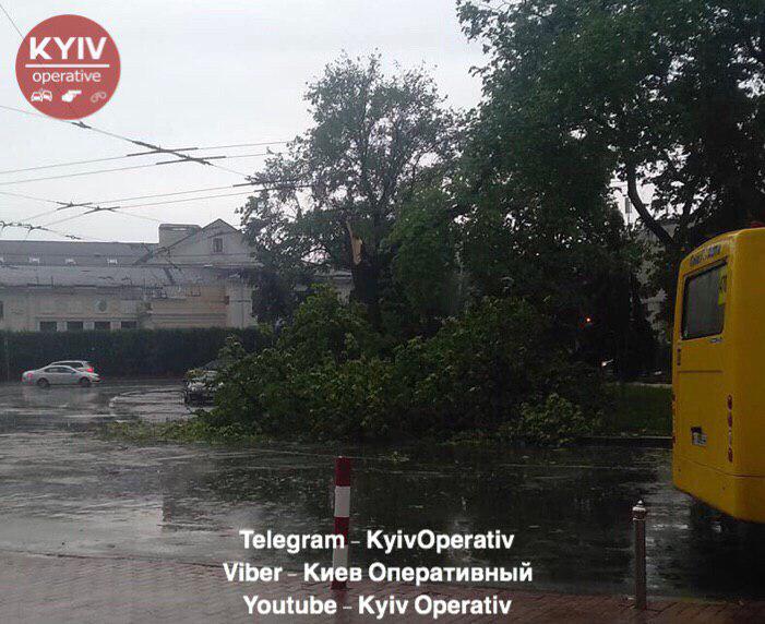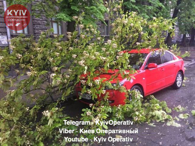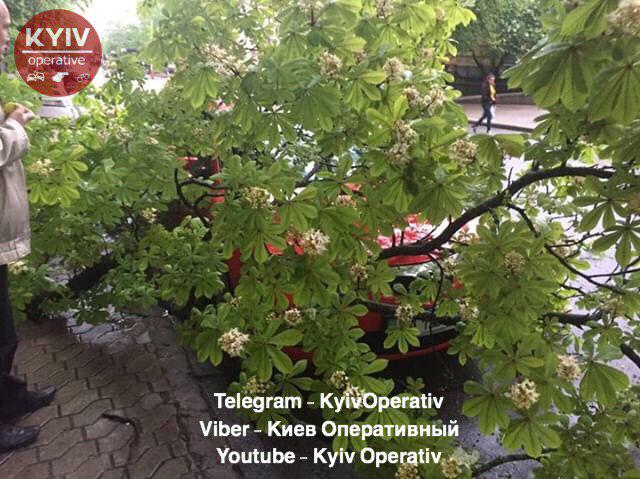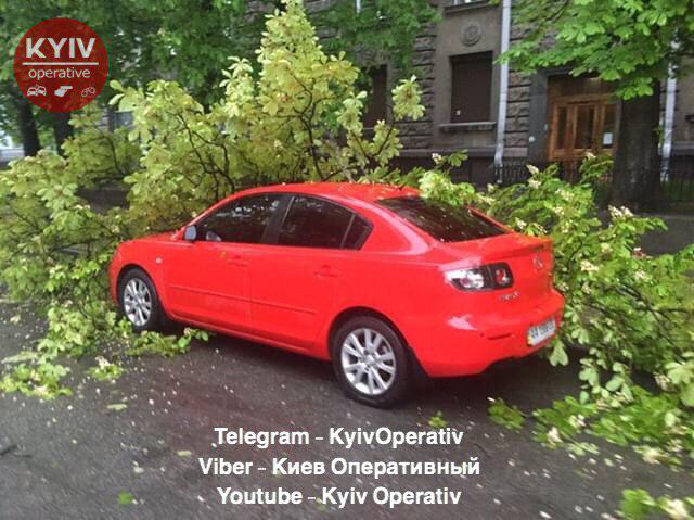 "На улице Банковой каштанчик тоже не выдержал этого ливня и упал на припаркованную Mazda. Обошлось без пострадавших", - сообщает "Киев Оперативный".