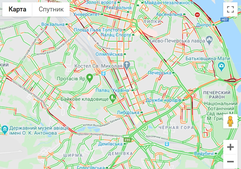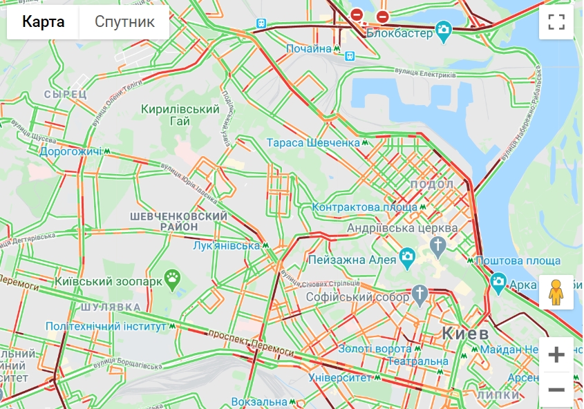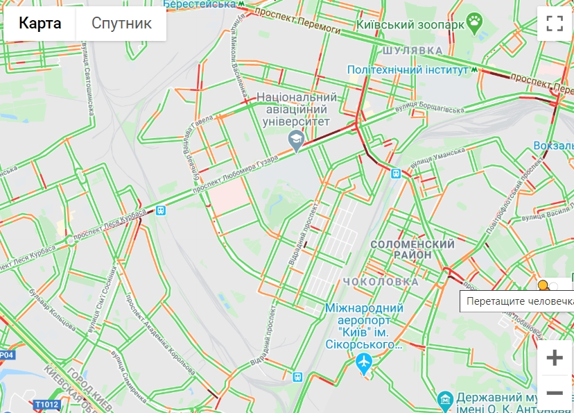 Так, пробки сковали проспекты Академика Палладина, Победы, Леся Курбаса, Валерия Лобановского, Голосеевский, Воздухофлотский, улицы Вадима Гетьмана, Борщаговскую, а также Кольцевую дорогу.