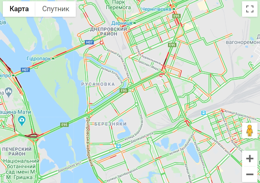 Пробки сковали и Северный, Гаванский и мост Патона. А на левом берегу такая ситуация наблюдалась на проспектах Бажана, Соборности, Броварском, Освободителей, улицах Братиславской и Кубанской Украины, а еще на Дарницком шоссе.
