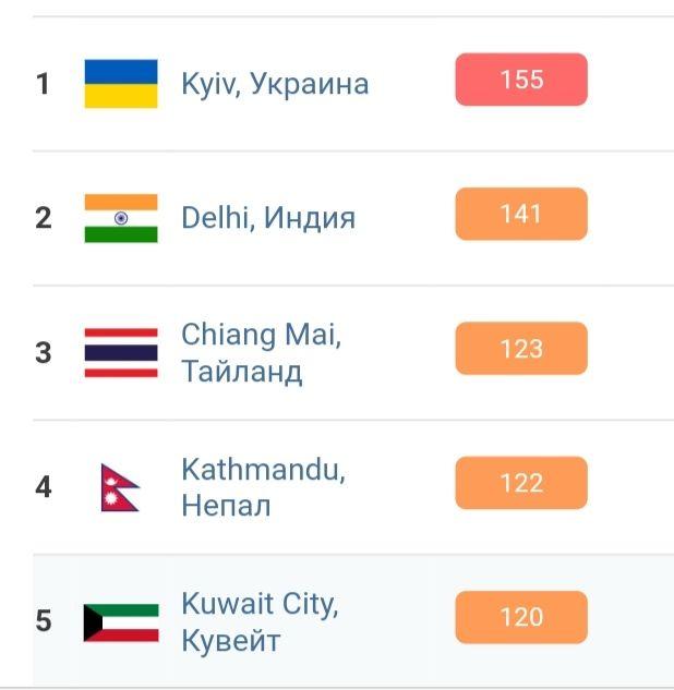 На втором месте после Киева с показателем 141 AQI расположилась столица Индии Дели, дальше идет Чианг Май – крупнейший город на севере Таиланда (123 AQI), четвертое место - Катманду, Непал (122 AQI). Замыкает топ-5 столица Кувейта с одноименным названием - 120 AQI.