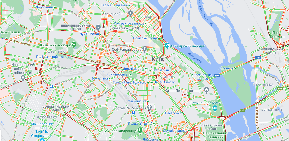 В районе развязки Победы и Черновола, на улицах Борщаговской и Жилянской в сторону центра и Воздухофлотском проспекте также наблюдаются заторы.