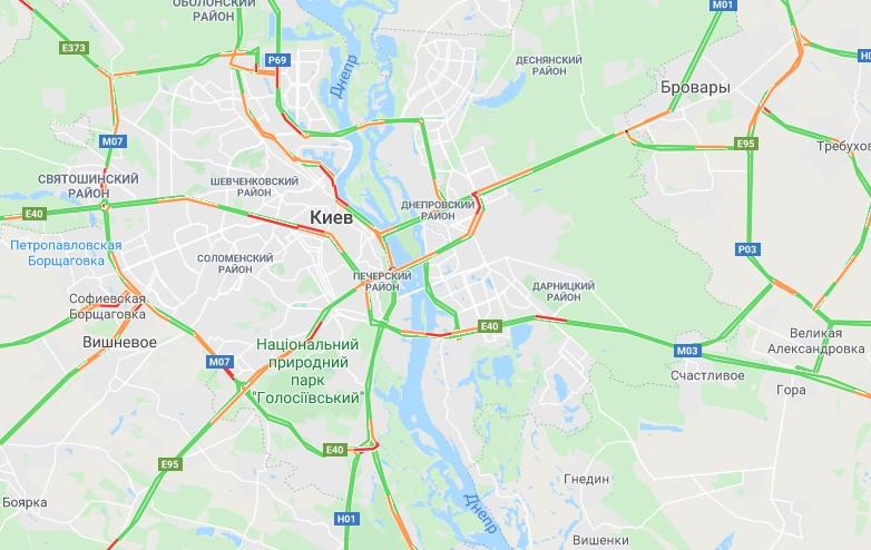 На левом берегу Киева высокий уровень заторов заметен на проспектах Соборности и Николая Бажана, Освободителей, Броварском проспекте и Дарницком шоссе.