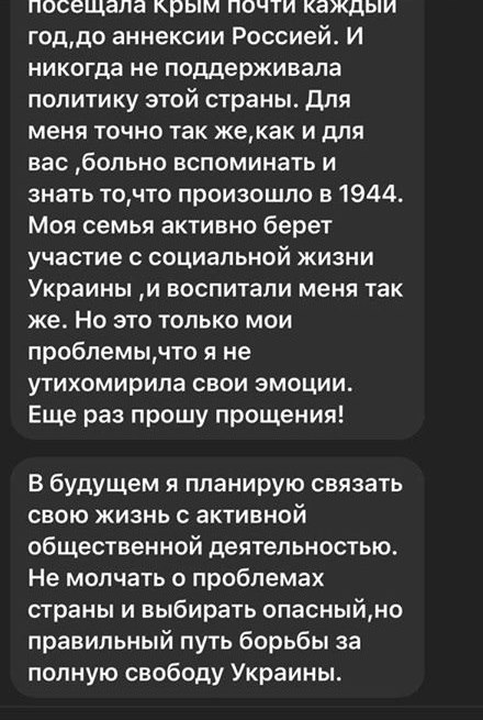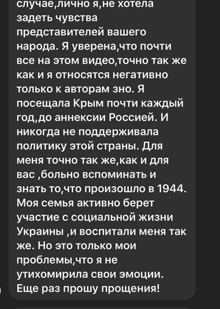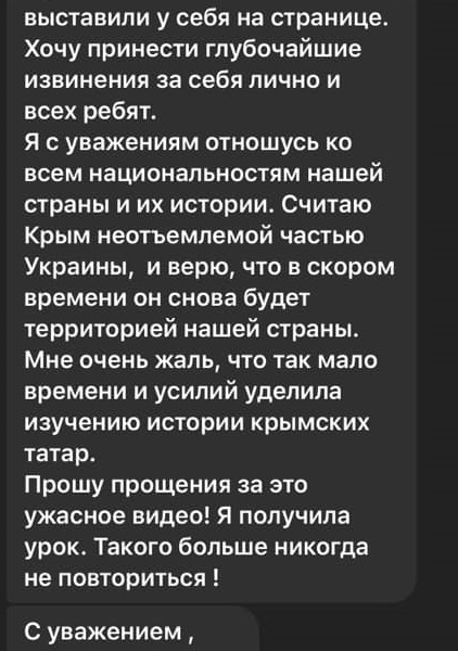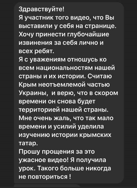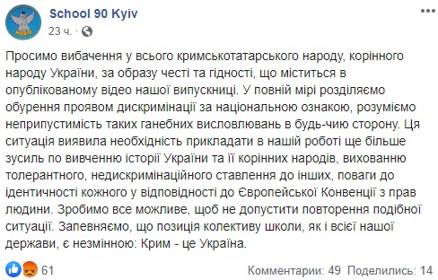 "Просим прощения у всего крымскотатарского народа, коренного народа Украины, за оскорбление чести и достоинства, что содержится в опубликованном видео нашей выпускницы. В полной мере разделяем возмущение проявлением дискриминации по национальному признаку, понимаем недопустимость таких позорных высказываний в чью-либо сторону. Эта ситуация выявила необходимость прикладывать в нашей работе еще больше усилий по изучению истории Украины и ее коренных народов, воспитанию толерантного, недискриминационного отношения к другим, уважения к идентичности каждого в соответствии с Европейской Конвенцией по правам человека. Сделаем все возможное, чтобы не допустить повторения подобной ситуации. Уверяем, что позиция коллектива школы, как и всего нашего государства, является неизменной: Крым - это Украина", - говорится в заявлении.