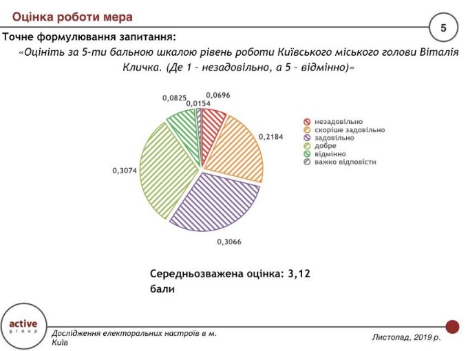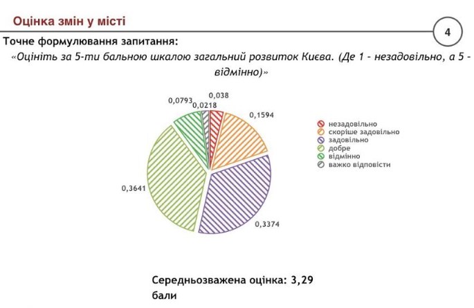 Подавляющее большинство опрошенных оценили работу Виталия Кличко на посту на "отлично", "хорошо" или "удовлетворительно". Общее развитие столицы участники социсследования оценили на 3,29 балла из 5.