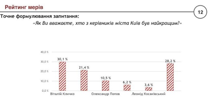 Так, большинство респондентов (30,1%) назвали Виталия Кличко лучшим руководителем Киева. Александра Попова таковым считают 10,5% опрошенных, Леонида Косаковского – 3,6%. Лидером антирейтинга стал Леонид Черновецкий: 41,6% респондентов назвали его наихудшим мэром.