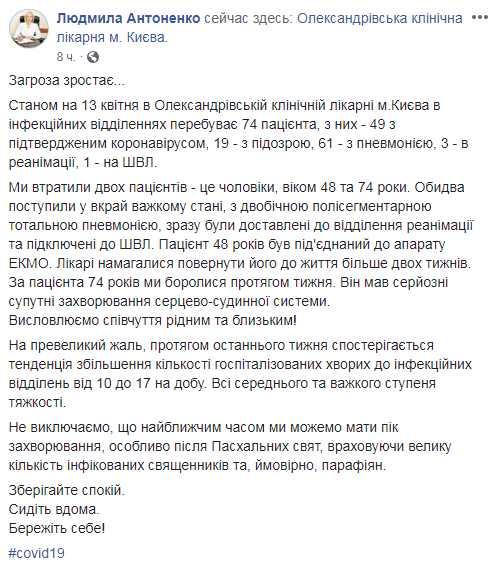По состоянию на 13 апреля в Александровской клинической больницы города Киева в инфекционных отделениях находится 74 пациента, из них - 49 с подтвержденным коронавирусом, 19 - с подозрением, 61 - с пневмонией, 3 - в реанимации, 1 - на ИВЛ.