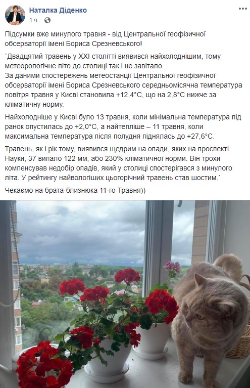 По данным наблюдений метеостанции Центральной геофизической обсерватории имени Бориса Срезневского среднемесячная температура воздуха мая в Киеве составляла +12,4°С, что на 2,8°С ниже климатической нормы.