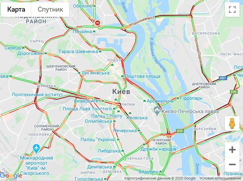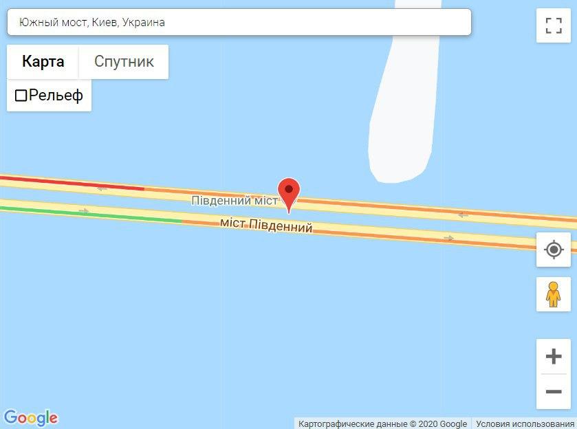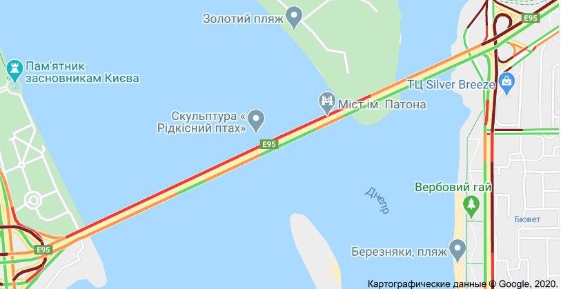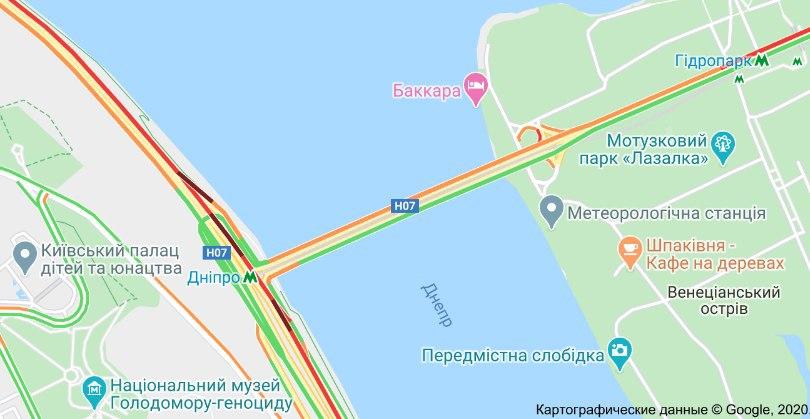 Как видно на карте, мосты через Днепр в Киеве загружены транспортом.