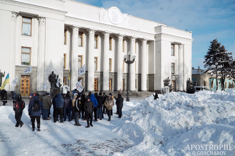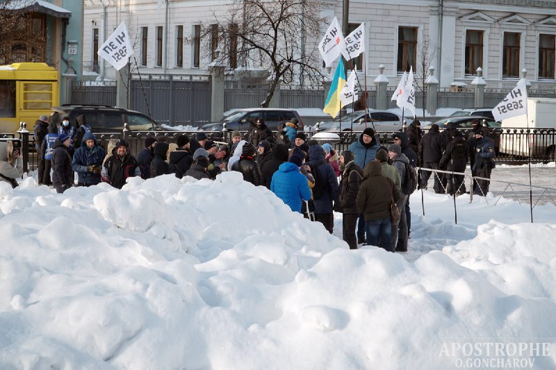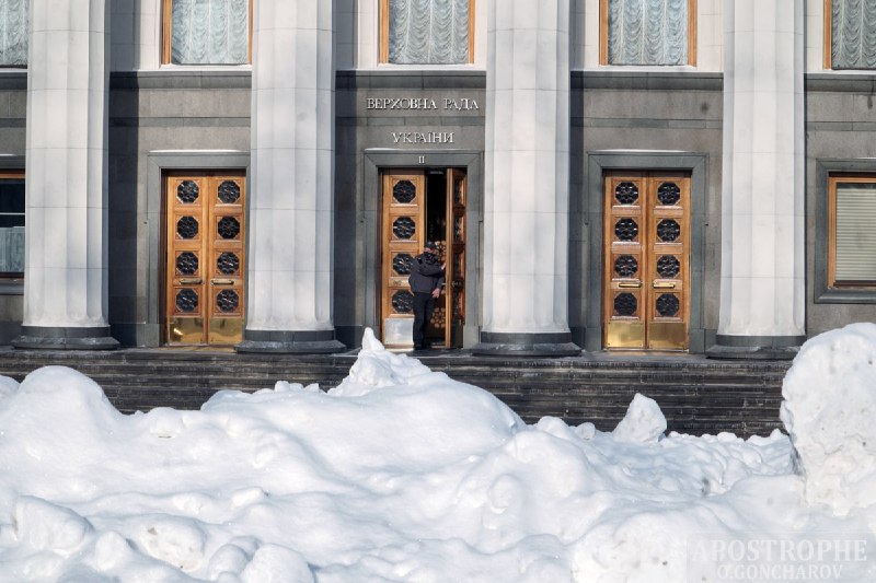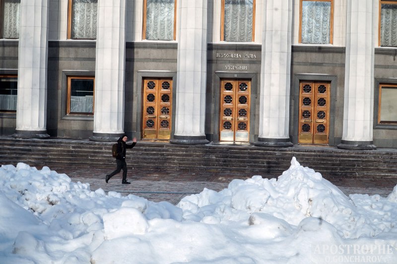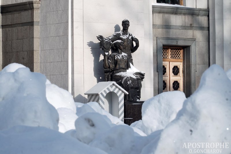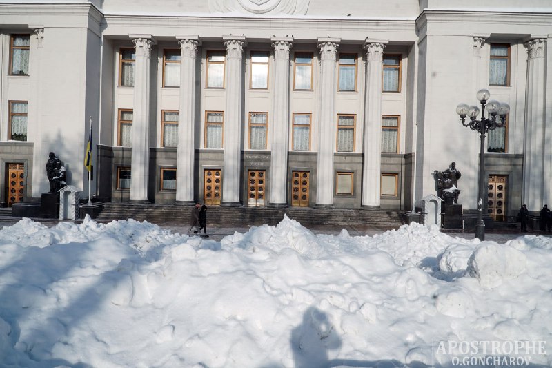 В Киеве площадь перед Верховной Радой Украины, где обычно проходят митинги, завалена толстым слоем снега.