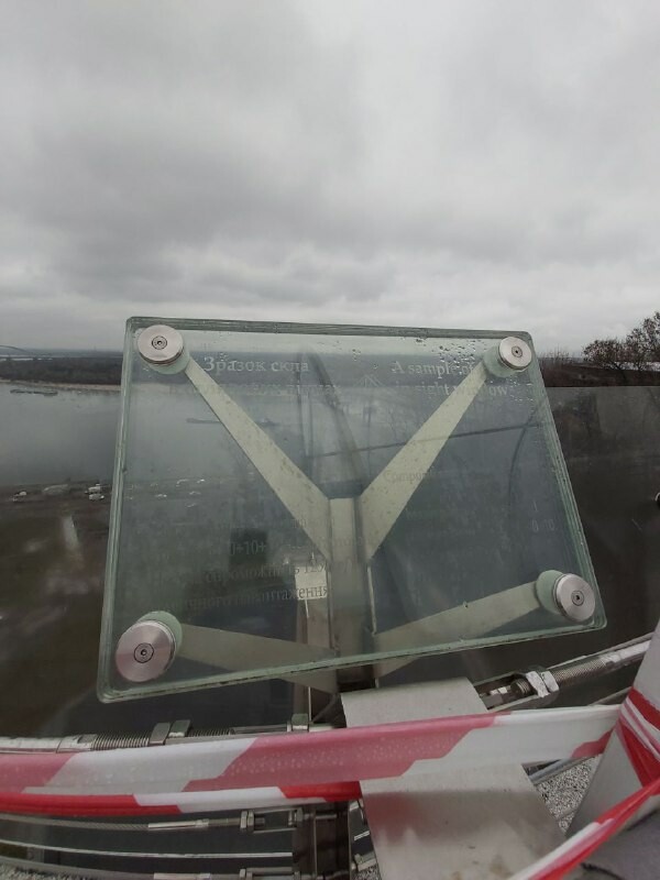 Как видно на снимках, обзорное стекло покрыто трещинами. Территория частично закрыта для прохода ограждающей лентой.