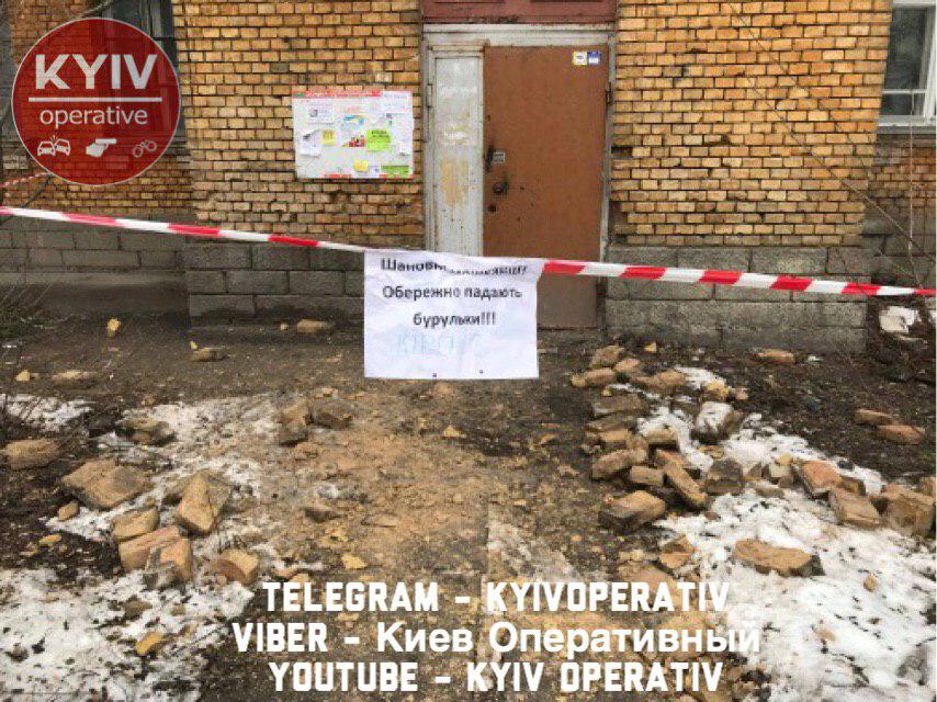 "14.02.2019 г. около 19:30 произошло обрушение кирпичной кладки фасада здания над подъездом №3 дома 1/26 по улице Курской (Соломенский район). Дом дореволюционной постройки имеет статус культурного наследия и нуждается в срочном ремонте. Обращения жильцов во все возможные инстанции в течении 30 лет не дали никакого результата. Кирпичная кладка разрушается по всему периметру здания. Опасно выходить из дома. Это просто чудо, что не было жертв в этот раз!", - говорится в сообщении.